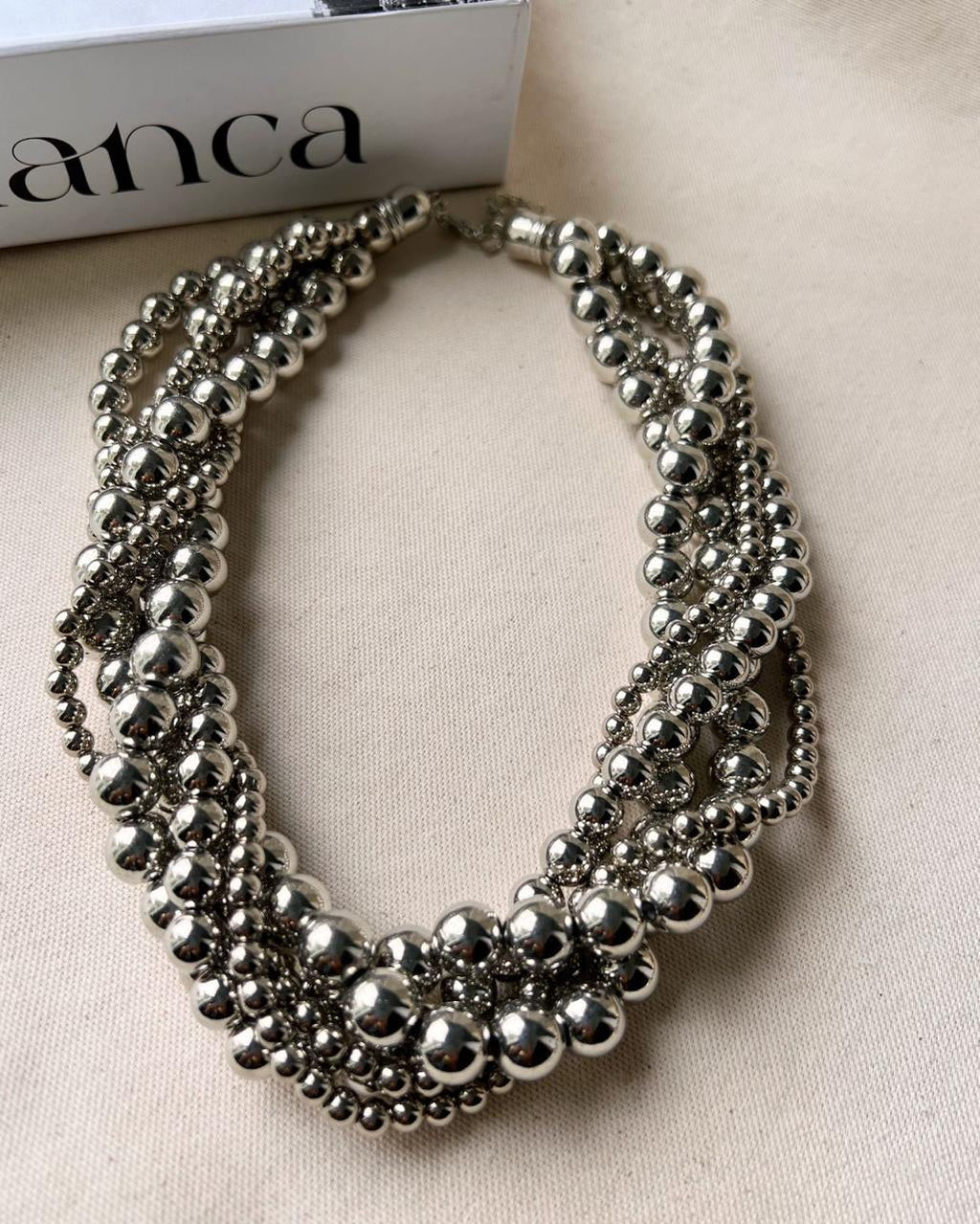 Com suas  5 voltas de esferas prateadas em tamanhos diferentes , o colar cria um visual marcante, moderno e sofisticado.